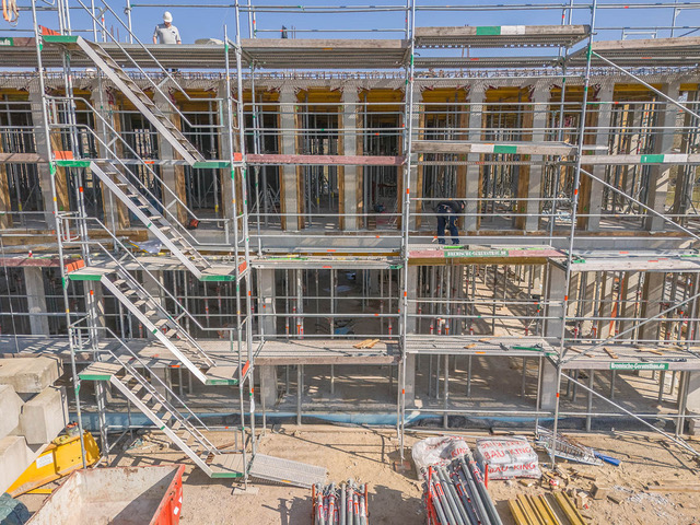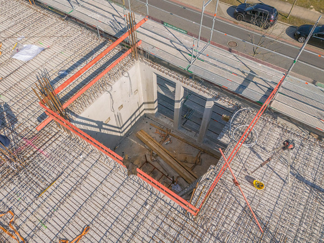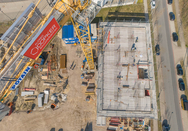 Bei aller Harmonie im äußeren Gesamteindruck wird eine starre Anmutung bewusst vermieden. Die vier Gebäude weisen mit ihren sechs bis sieben Etagen leicht variierende Gesamthöhen auf, gruppieren sich aufgelockert um einen begrünten Innenhof und werden von einem Mobilitätshaus mit rund 160 Stellplätzen und zahlreichen E-Ladestationen stimmig komplettiert. Dieselbe funktionale Leichtigkeit prägt auch das Innere: So können etwa die Flächen bereits ab 250 Quadratmetern individuell an Mieterwünsche angepasst werden, Hohlraumböden bieten hohe Flexibilität beim Positionieren von Arbeitsplätzen, und darüber hinaus sorgen mindestens drei Meter hohe Räume, ein hoher Fassaden-Glasanteil von 65 Prozent sowie eine Gemeinschafts-Dachterrasse für ein überaus großzügiges Bürogefühl.